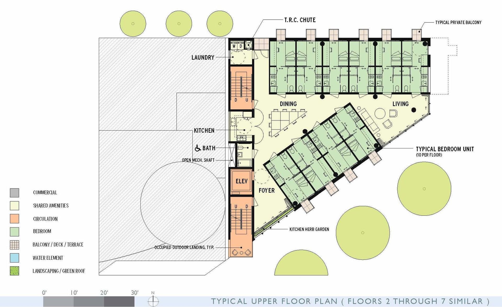 Each upper story consists of a single cooperative rental dwelling unit composed of 10 bedroom suites that share spacious common facilities: living room, dining room, full kitchen, accessible bathroom, laundry, etc. Each suite contains a single-user bedroom with its own private mini-bathroom and kitchenette. Various custom built-in features allow the occupant to easily transform the suite to accommodate studying and entertaining as well as sleeping functions.