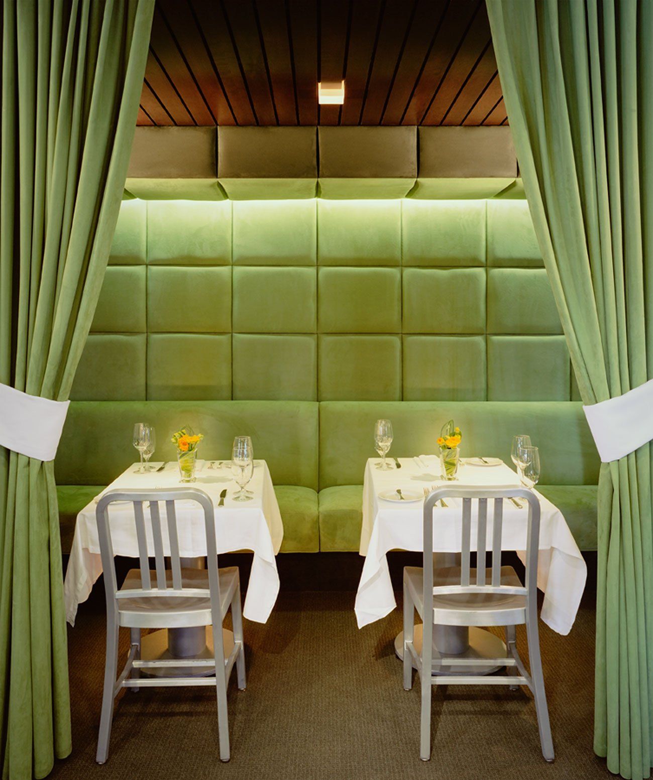 This entry structure creates a waiting lounge that functions as a decompression zone as one progresses from the sidewalk to the dining room. The interior walls, draperies, and seating are upholstered entirely in synthetic suede, and a rich dark wood is used at the ceiling, the bar area, and for various furnishings throughout. All the elements work together to create an ambience that is elegant, subdued, and intimate.